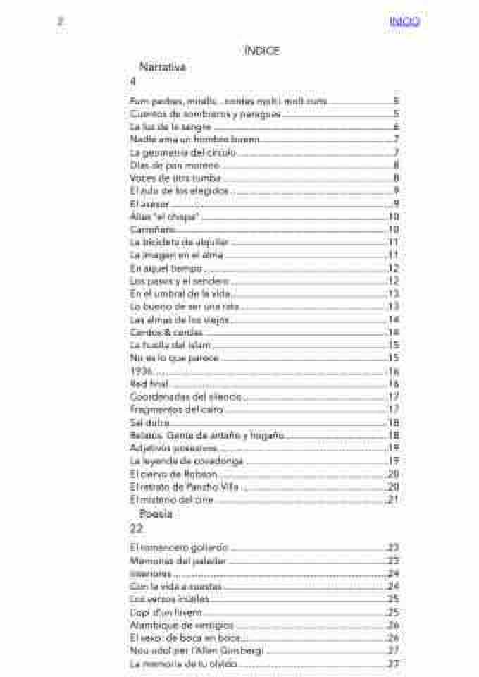 Fum pedres, miralls... contes molt i molt curts ..........................5 Cuentos de sombreros y paraguas.............................................5 La luz de la sangre ........................................................................6 Nadie ama un hombre bueno.....................................................7 La geometría del círculo ..............................................................7 Días de pan moreno .....................................................................8 Voces de otra tumba ....................................................................8 El zulo de los elegidos .................................................................9 El asesor .........................................................................................9 Alias “el chispa” ...........................................................................10 Carroñero .....................................................................................10 La bicicleta de alquiler ...............................................................11 La imagen en el alma .................................................................11 En aquel tiempo..........................................................................12 Los pasos y el sendero ...............................................................12 En el umbral de la vida...............................................................13 Lo bueno de ser una rata ...........................................................13 Las almas de los viejos ...............................................................14 Cerdos & cerdas .........................................................................14 La huella del islam ......................................................................15 No es lo que parece ...................................................................15 1936 ..............................................................................................16 Red final .......................................................................................16 Coordenadas del silencio ..........................................................17 Fragmentos del cairo .................................................................17 Sal dulce.......................................................................................18 Relatos. Gente de antaño y hogaño .........................................18 Adjetivos posesivos ....................................................................19 La leyenda de covadonga .........................................................19 El ciervo de Robson....................................................................20 El retrato de Pancho Villa ...........................................................20 El misterio del cine .....................................................................21